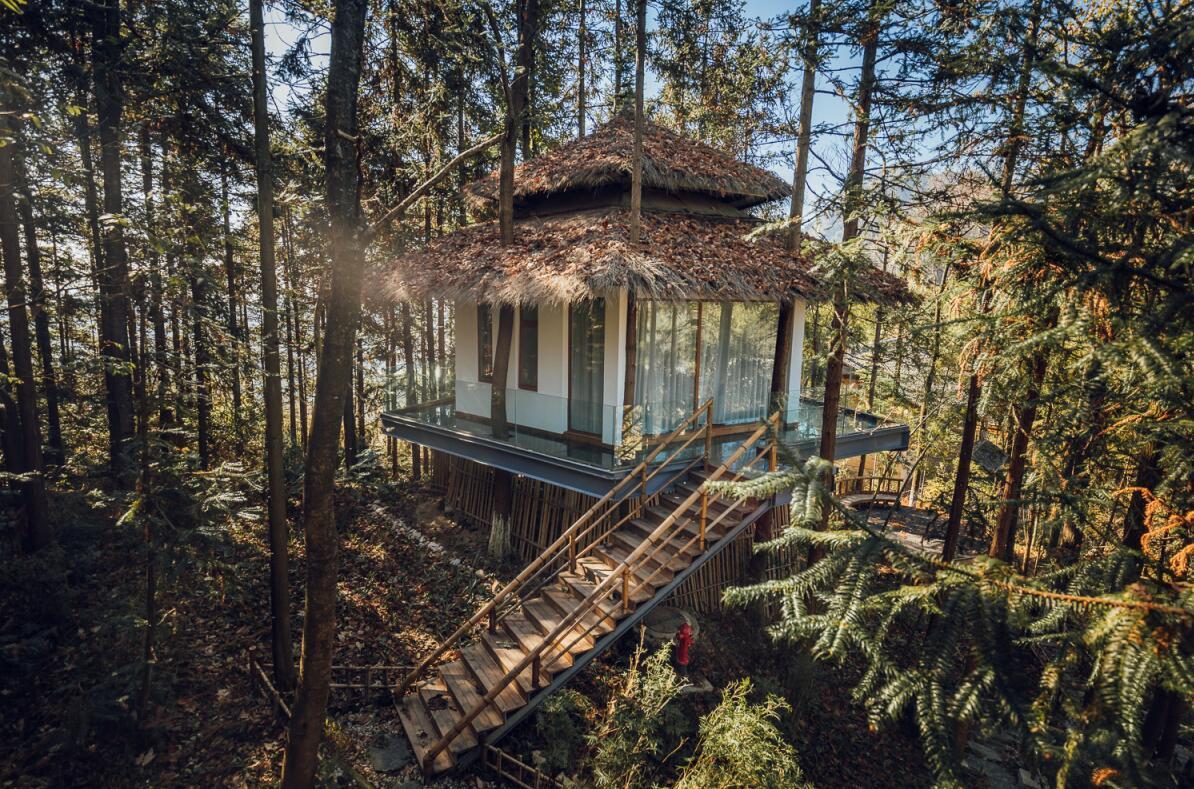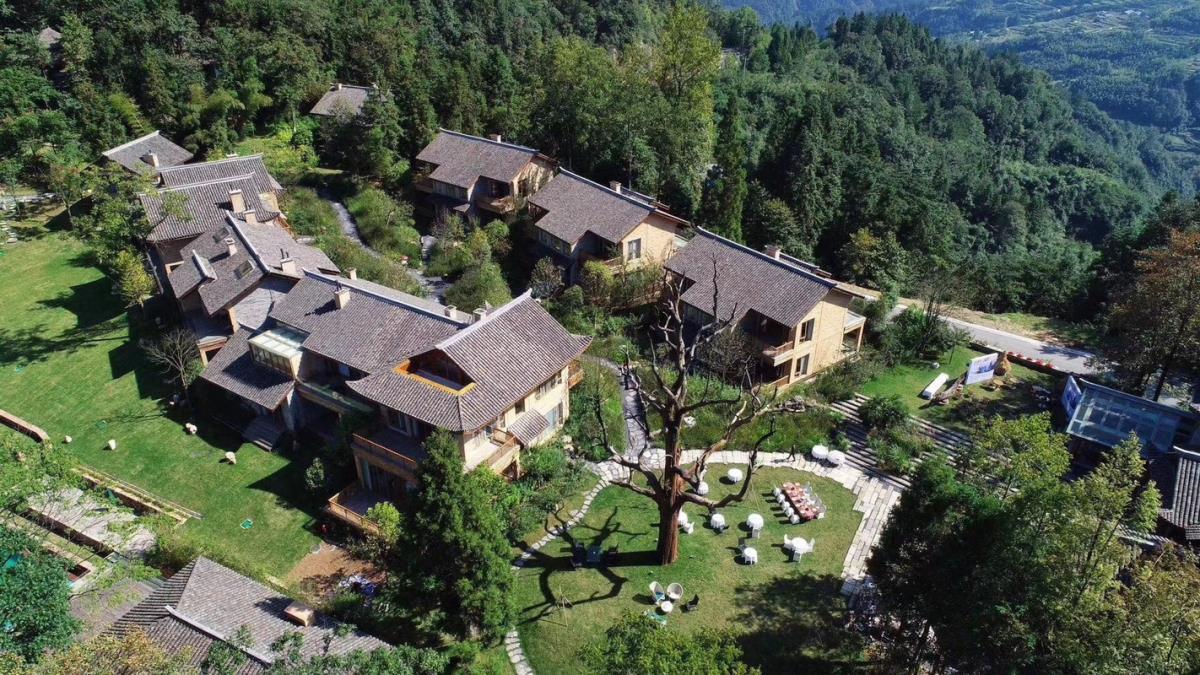 酒店建筑主体采用湘西吊脚楼的形态,并全部选用当地原生态建筑材料,延续土家族元素的同时注重环保,以最有故事的千年梓树为中心,用自然手法提升景观。