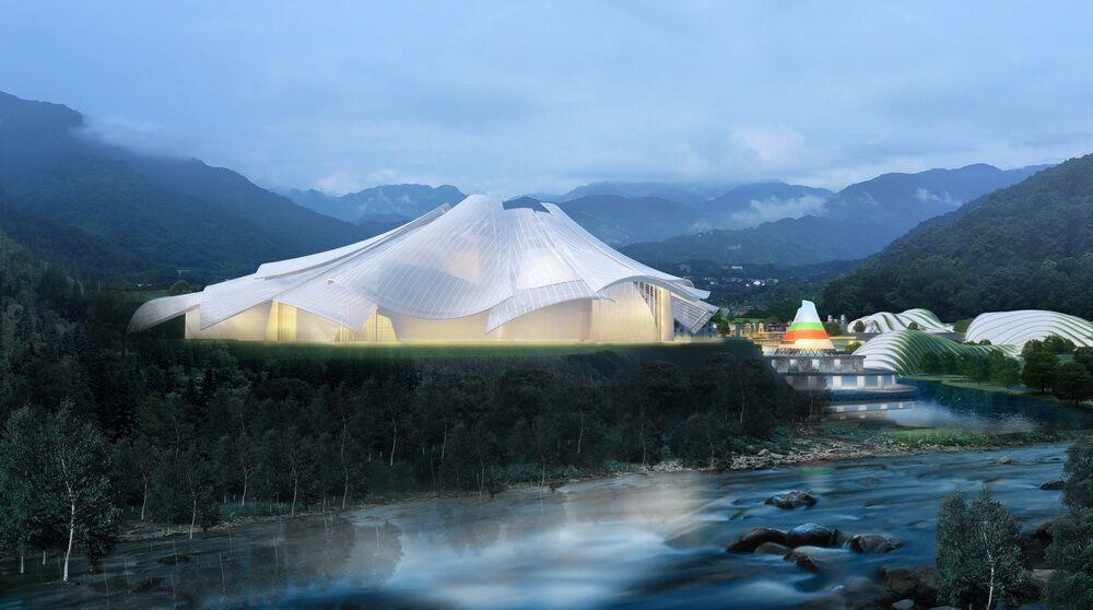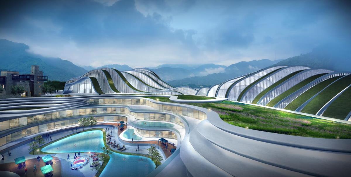 一街二院三中心是规划主要核心,项目涵盖了酒店、养生中心、飞行影院、祈福塔、购物中心等。通过对场地的思考,将空间分为点、序、引三个界面。由“飘逸动感,连绵起伏,山水诗意”的山谷建筑,再穿越异域风情的九转寨子,直到气势恢弘的剧院和祈福塔,联通旅游业态,凝萃文化精髓。