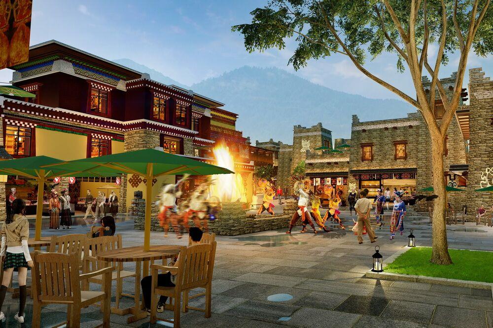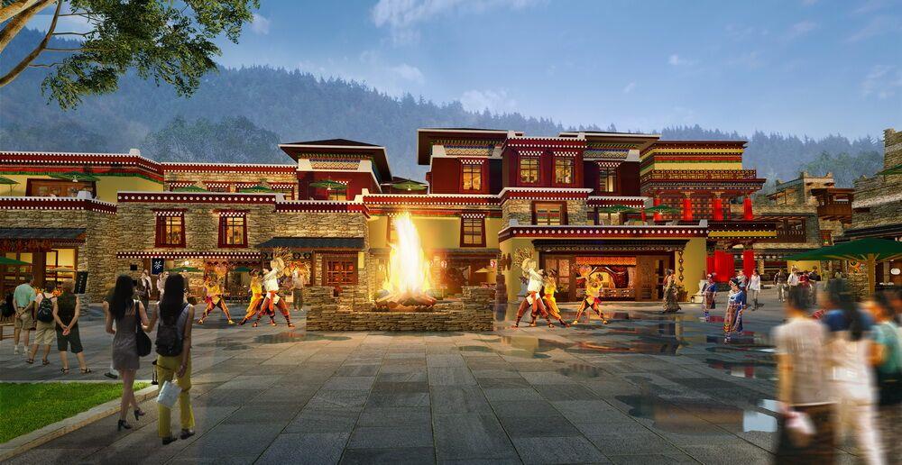 项目位于四川松潘县,整合和拓展四川阿坝州、九寨沟文化资源,以药泉特色为导向,集聚住宿、演艺、商业、文化四大要素,构建独具特色、民族氤氲的药温泉国际度假区。